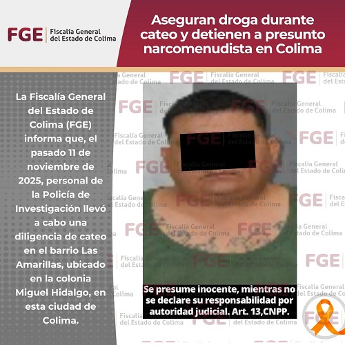 La Fiscalía General del Estado de Colima (FGE) informa que, el pasado 11 de noviembre de 2025, personal de la Policía de Investigación llevó a cabo una diligencia de cateo en el barrio Las Amarillas, ubicado en la colonia Miguel Hidalgo, en esta ciudad de Colima.