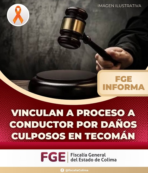 La Fiscalía General del Estado de Colima obtuvo en audiencia inicial la vinculación a proceso de Isaías “N” por el hecho que la ley señala como delito de daños culposos, derivado de un hecho de tránsito ocurrido el 18 de mayo de 2023 en la cabecera municipal de Tecomán.