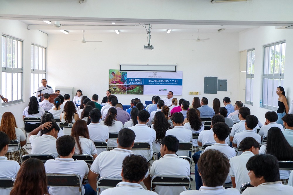 Los directores de los Bachilleratos 21 y 7 de la Universidad de Colima, ubicados en la cabecera municipal de Armería, llevaron a cabo esta semana un ejercicio de rendición de cuentas en el que expusieron avances en estabilidad de matrícula, formación académica, participación social, capacitación docente y acompañamiento estudiantil, lo que reflejó el fortalecimiento del nivel medio superior de la institución en este municipio costero.