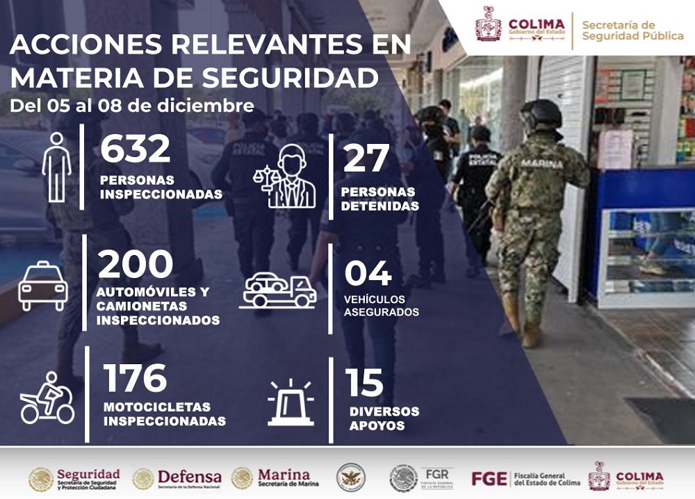 La Secretaría de Seguridad Pública (SSP) del Gobierno del Estado de Colima informa que, en coordinación con personal operativo de la Secretaría de Marina Armada de México (Semar) y elementos de la Policía Estatal Preventiva (PEP), se llevó a cabo un despliegue estratégico como parte de la 'Operación Coliman', con el propósito de disminuir la incidencia delictiva en colonias identificadas por registros de violencia, delitos de alto impacto y robo.