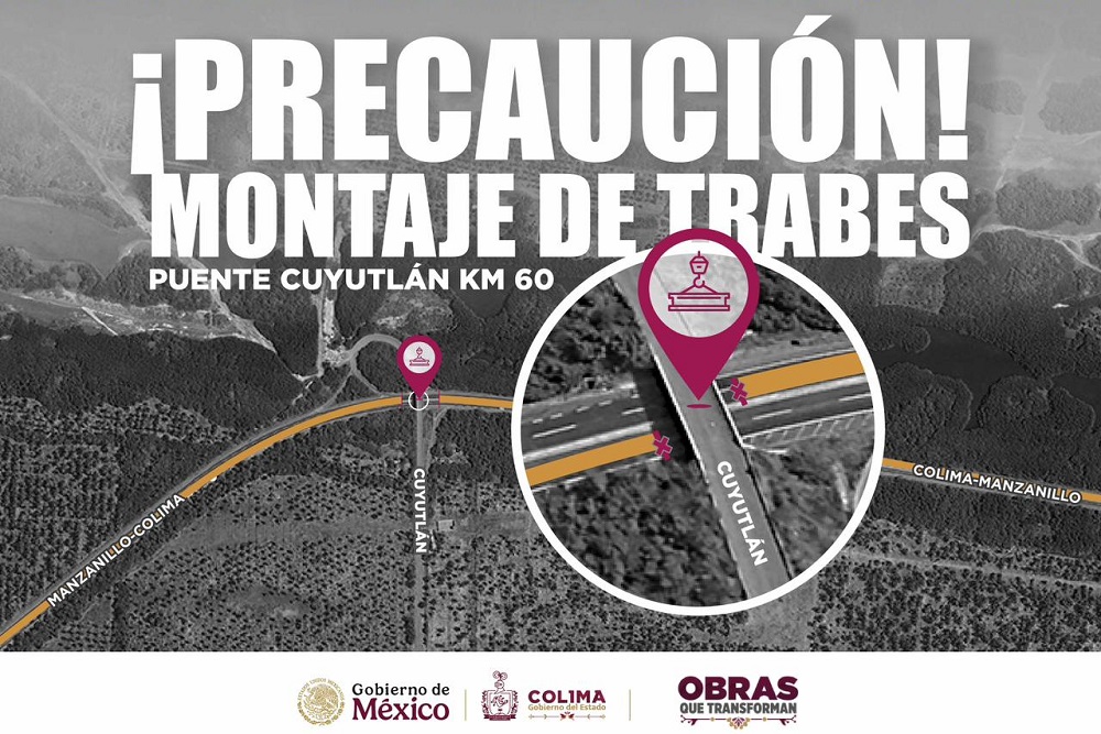 La Secretaría de Infraestructura, Desarrollo Urbano y Movilidad (SEIDUM) del Gobierno del Estado de Colima informa que este miércoles 10 de diciembre se realizarán trabajos de montaje de trabes en el puente Cuyutlán, ubicado a la altura del kilómetro 60 de la autopista Colima-Manzanillo.