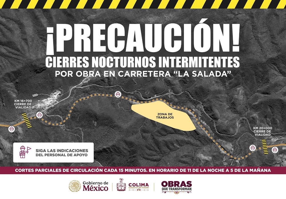 La Secretaría de Infraestructura, Desarrollo Urbano y Movilidad (Seidum) del Gobierno del Estado de Colima informa a las y los colimenses, así como a transportistas y turistas que visitan la entidad, que se ha establecido un nuevo esquema de trabajos en el tramo de ‘La Salada’, durante la ampliación de la autopista Colima-Manzanillo.