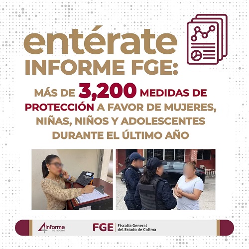 En el marco del Cuarto Informe de Actividades del Fiscal General del Estado, Bryant Alejandro García Ramírez, la Fiscalía General del Estado de Colima (FGE) informa que, del 01 de noviembre de 2024 al 31 de octubre de 2025, fortaleció de manera significativa su compromiso con la protección de los derechos de las mujeres y de los grupos en situación de vulnerabilidad.