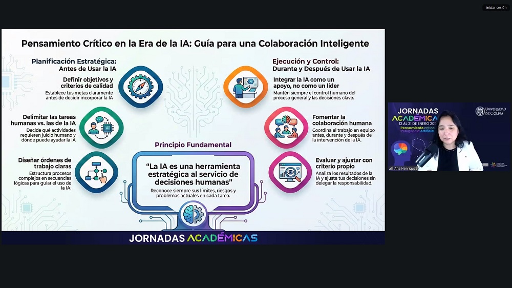 *Ana Henríquez, de la Universidad de las Américas (Chile), dictó la conferencia virtual “Buenas prácticas docentes utilizando IA”, como parte de las Jornadas Académicas 2026 de la Universidad de Colima