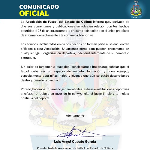 La Asociación de Fútbol del Estado de Colima informa que, derivado de diversos comentarios y publicaciones surgidas en relación con los hechos ocurridos el 25 de enero, se emite la presente aclaración con el único propósito de informar correctamente a la comunidad deportiva.