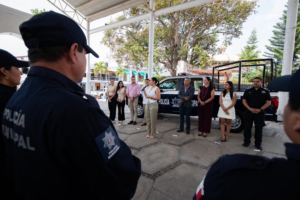 La gobernadora de Colima, Indira Vizcaíno Silva, realizó este viernes la entrega de ocho patrullas en Manzanillo y una más en Minatitlán, así como uniformes, calzado y equipo táctico a policías municipales, para que al momento de hacer su trabajo cuenten con mejores herramientas y puedan cumplir mejor su responsabilidad de prevenir y atender la seguridad en sus comunidades.