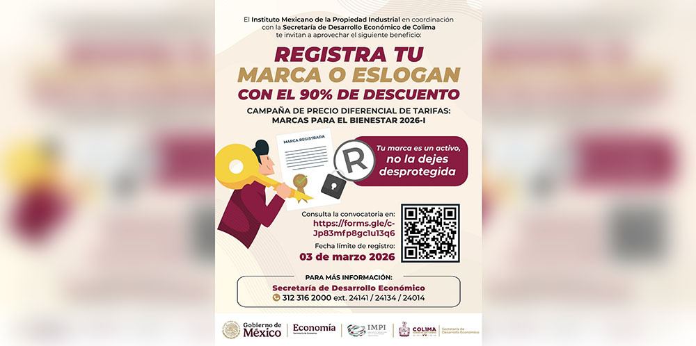 El Gobierno del Estado de Colima, a través de la Secretaria de Desarrollo Económico (Sedeco), en coordinación con el Instituto Mexicano de la Propiedad Industrial (IMPI), invitan a las personas emprendedoras, así como a las micro, pequeñas y medianas empresas –mipymes- de la entidad, a participar en la campaña ‘Marcas para el Bienestar 2026-I’, mediante la cual podrán registrar su marca o eslogan con un 90% de descuento en el pago de derechos.