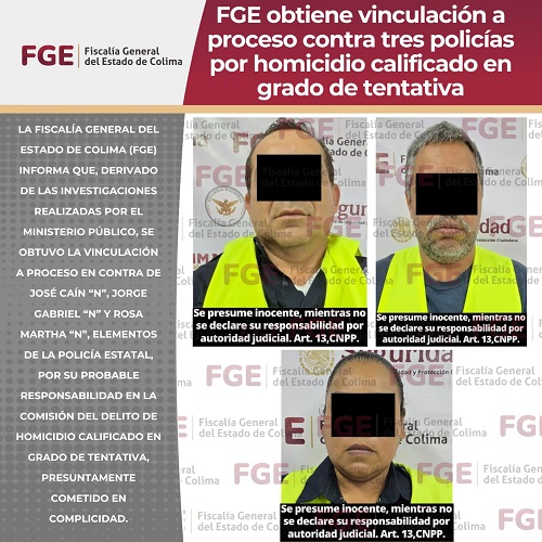 La Fiscalía General del Estado de Colima (FGE) informa que, derivado de las investigaciones realizadas por el Ministerio Público, se obtuvo la vinculación a proceso en contra de José Caín “N”, Jorge Gabriel “N” y Rosa Martha “N”, elementos de la Policía Estatal, por su probable responsabilidad en la comisión del delito de homicidio calificado en grado de tentativa, presuntamente cometido en complicidad.