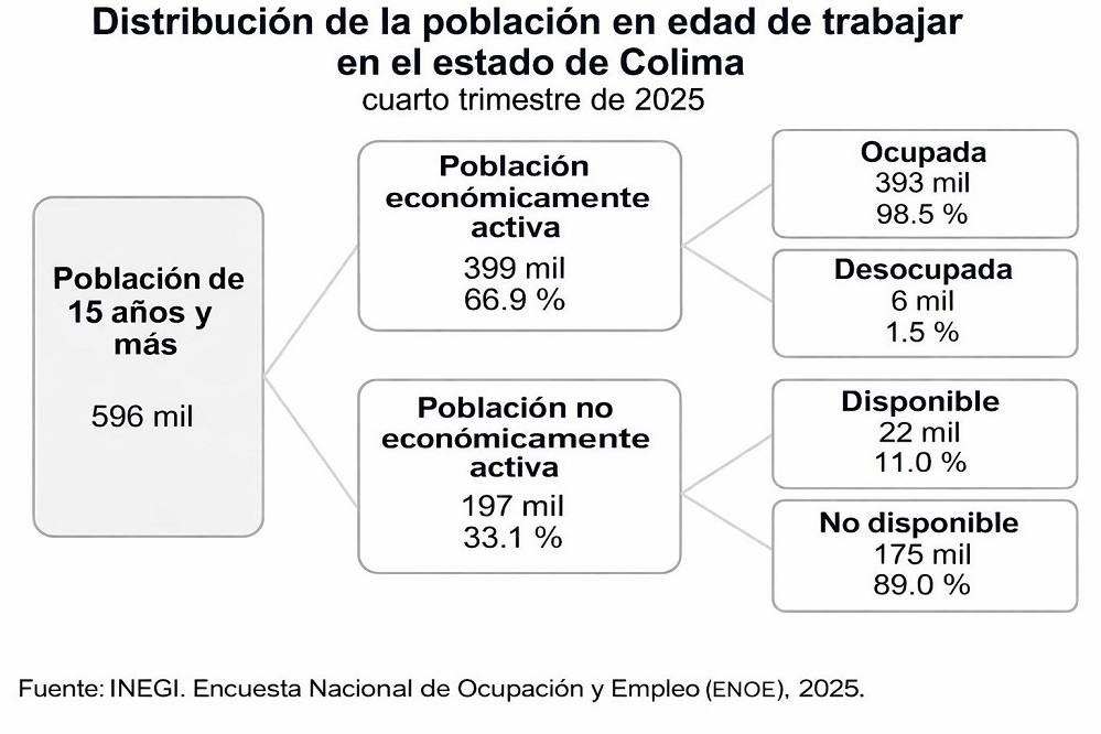 En el trimestre octubre-diciembre de 2025, la población desocupada en Colima fue de 6 mil personas y la tasa de desocupación (TD), de 1.5 % de la PEA. El porcentaje fue menor en 0.7 puntos porcentuales al del mismo trimestre de 2024.