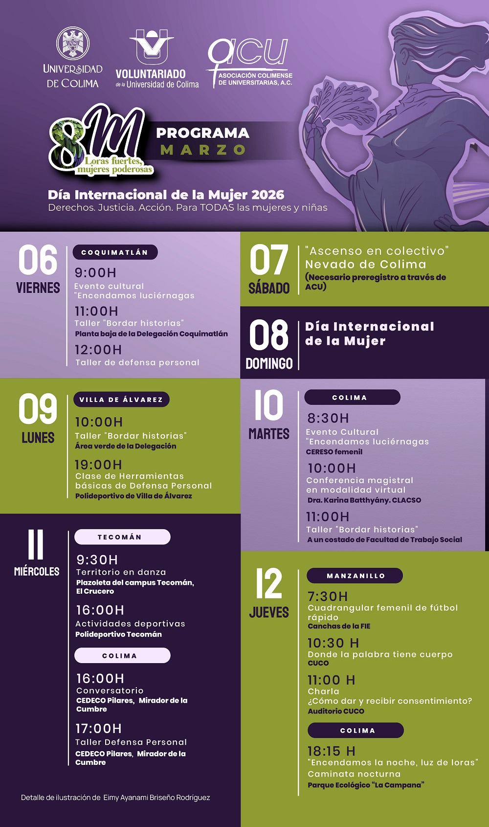 El viernes 6, en Coquimatlán, además del evento inaugural, se realizará a las 11 de la mañana el taller “Bordar historias”, en la planta baja del edificio de la Delegación y, a las 12:00 horas, habrá un taller de defensa personal. El sábado 7 se llevará a cabo el ascenso colectivo al Nevado de Colima (con pre-registro a través de la Asociación Colimense de Universitarias, ACU), y el domingo 8 se conmemorará el Día Internacional de las Mujeres.