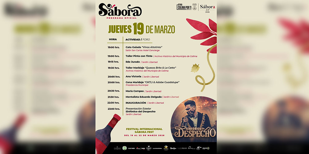Hoy jueves, el presidente municipal de Colima, Riult Rivera Gutiérrez, inaugurará la octava edición del Festival Internacional Sábora Fest 2026, evento que se desarrollará en el foro principal del Jardín Libertad, a las 22:30 horas, aunque las actividades artísticas, vinícolas y culturales iniciarán desde horas de la tarde.