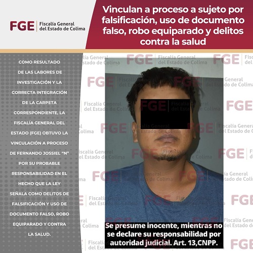 Como resultado de las labores de investigación y la correcta integración de la carpeta correspondiente, la Fiscalía General del Estado (FGE) obtuvo la vinculación a proceso de Fernando Jossiel “N” por su probable responsabilidad en el hecho que la ley señala como delitos de falsificación y uso de documento falso, robo equiparado y contra la salud.