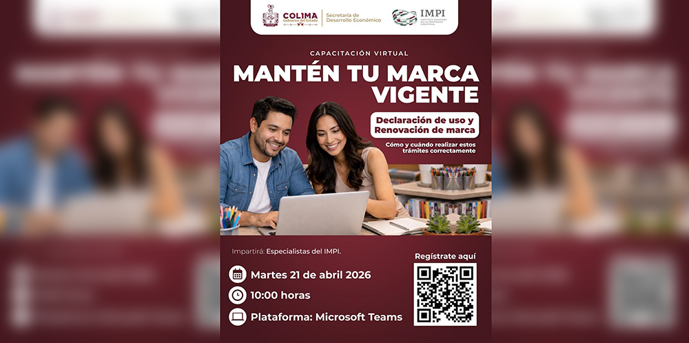 El Gobierno del Estado de Colima, que preside la mandataria Indira Vizcaíno Silva, a través de la Secretaría de Desarrollo Económico (Sedeco), invita a personas emprendedoras y empresarias a la capacitación virtual ‘Mantén tu marca vigente’, donde se abordarán los procesos de Declaración de Uso y Renovación de marca, así como los tiempos adecuados para realizarlos.