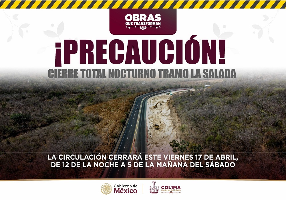 La Secretaría de Infraestructura, Desarrollo Urbano y Movilidad (Seidum) del Gobierno del Estado de Colima, comunica que con motivo de las acciones de modernización del Corredor Logístico Colima-Manzanillo, habrá cierre total de la autopista Colima-Manzanillo durante la noche del viernes 17 de abril, específicamente en la zona conocida como La Salada (km 20+400).