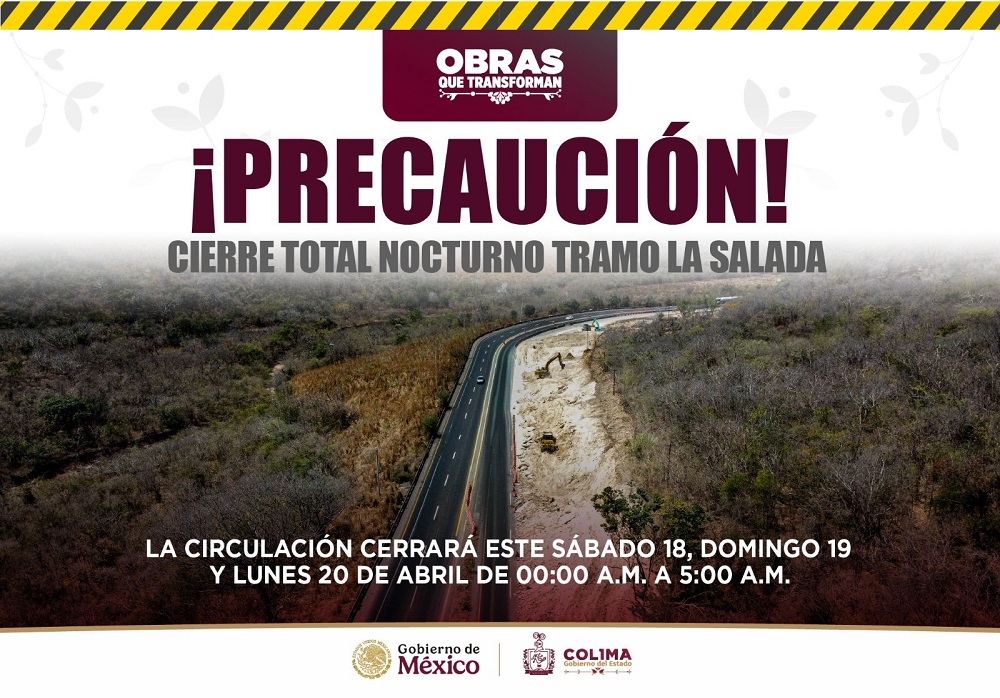 El Gobierno del Estado de Colima, a través de la Secretaría de Infraestructura, Desarrollo Urbano y Movilidad (Seidum), informa que, como parte de los trabajos de mejora en la autopista Colima-Manzanillo, se llevará a cabo el cierre total de la autopista que comunica la capital con el puerto, a la altura del kilómetro 20+400 en la zona conocida como La Salada.
