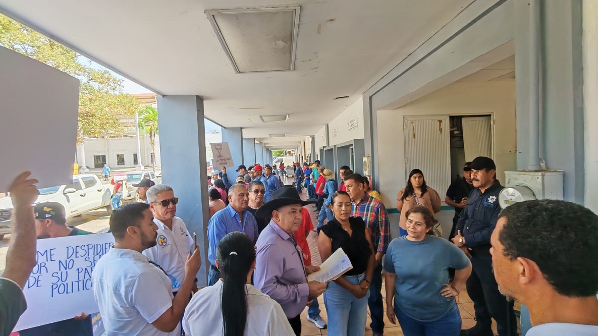 Minatitlán, Col. Apoyados por líderes sindicales pertenecientes a la Unión de Sindicatos, trabajadores del Ayuntamiento de Minatitlán se manifestaron este jueves por la tarde al exterior de la presidencia municipal para exigir al presidente municipal, Alejandro Ciserón Mancilla González, a quien acusaron de despedir injustificadamente a once trabajadores sindicalizados, para basificar a veinte familiares.