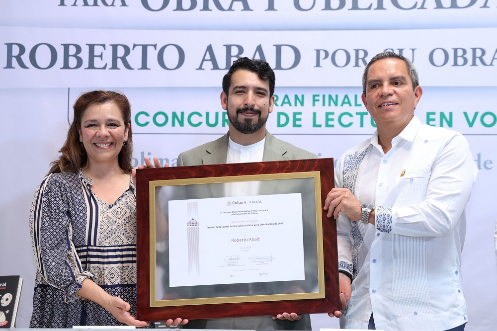 Este lunes, en la Pinacoteca Universitaria, se llevó a cabo la entrega del Premio Bellas Artes de Narrativa Colima por Obra Publicada 2025 al escritor morelense Roberto Abad, por su libro de cuentos Umbral. Este premio lo otorgan la Secretaría de Cultura del Gobierno de México y el Instituto Nacional de Bellas Artes y Literatura (INBAL), a través de la Coordinación Nacional de Literatura (CNL) y la Universidad de Colima.