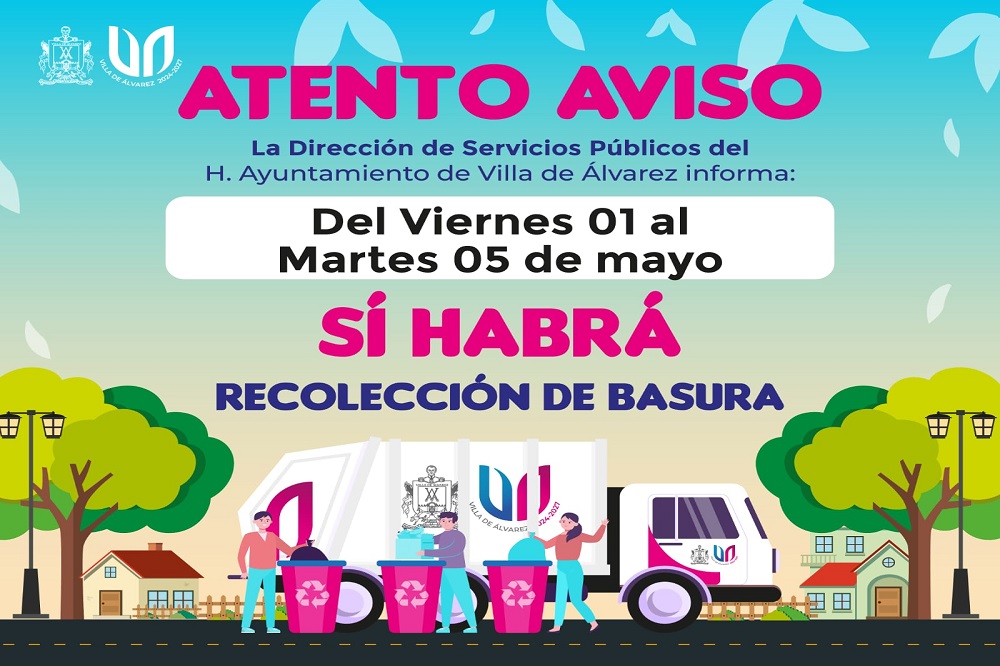 El Ayuntamiento de Villa de Álvarez, a través de la Dirección de Servicios Públicos, informa a la población que los días viernes 1, sábado 2, domingo 3, lunes 4 y martes 5 de mayo, la recolección de basura en las colonias y comunidades del municipio se realizará de manera normal.