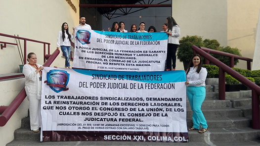 Con mantas que exigen la reinstauración de los derechos laborales, esta mañana trabajadores del Poder Judicial de la Federación en el estado de Colima se manifestaron en el exterior de sus oficinas.