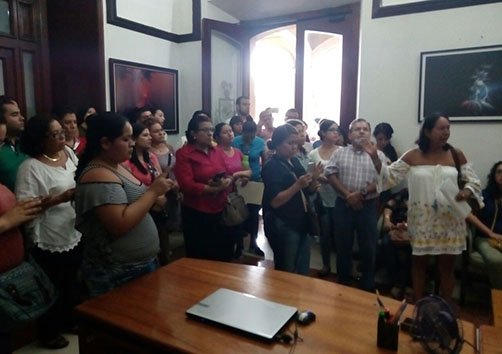 Un nutrido grupo de docentes que impartían la clase de inglés en las escuelas primarias de tiempo completo y que hoy se les informó no serían renovados sus contratos por falta de presupuesto, se manifiestan en Palacio de Gobierno, y exigen al Gobernador José Ignacio Peralta Sánchez les sea respetado su trabajo.
