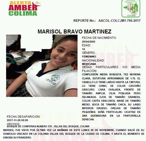 Este martes fue activada la Alerta Amber, debido a la no localización de la menor de Marisol Bravo Martínez, de 14 años de edad, quien fue vista por última vez el lunes 20 de noviembre cuando salió de su casa, en la colonia Villas del Bosque de la ciudad de Colima.