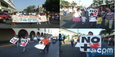 Aunque no llegaban a un centenar de personas pero ahí estaban, cumplidas, sin miedo, preocupados y con el ánimo de manifestarse a favor de la paz y en contra de la sangre, seguros de tomar parte en la marcha denominada “No más Sangre”; ahí había niños que escribían sus mensajes en una cartulina, había jóvenes, madres y padres de familia, adultos en plenitud, personas con capacidades diferentes y hasta uno que otro político.